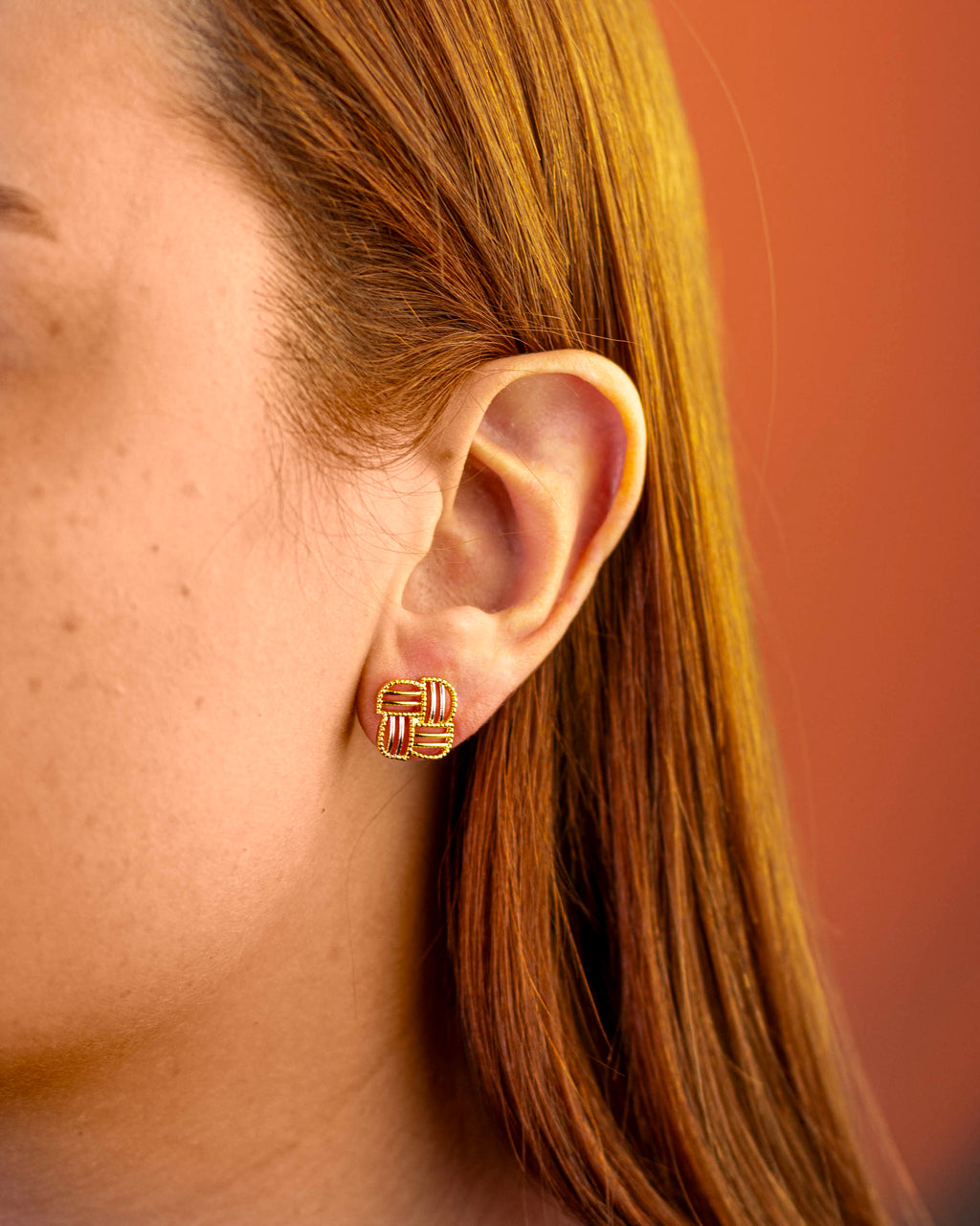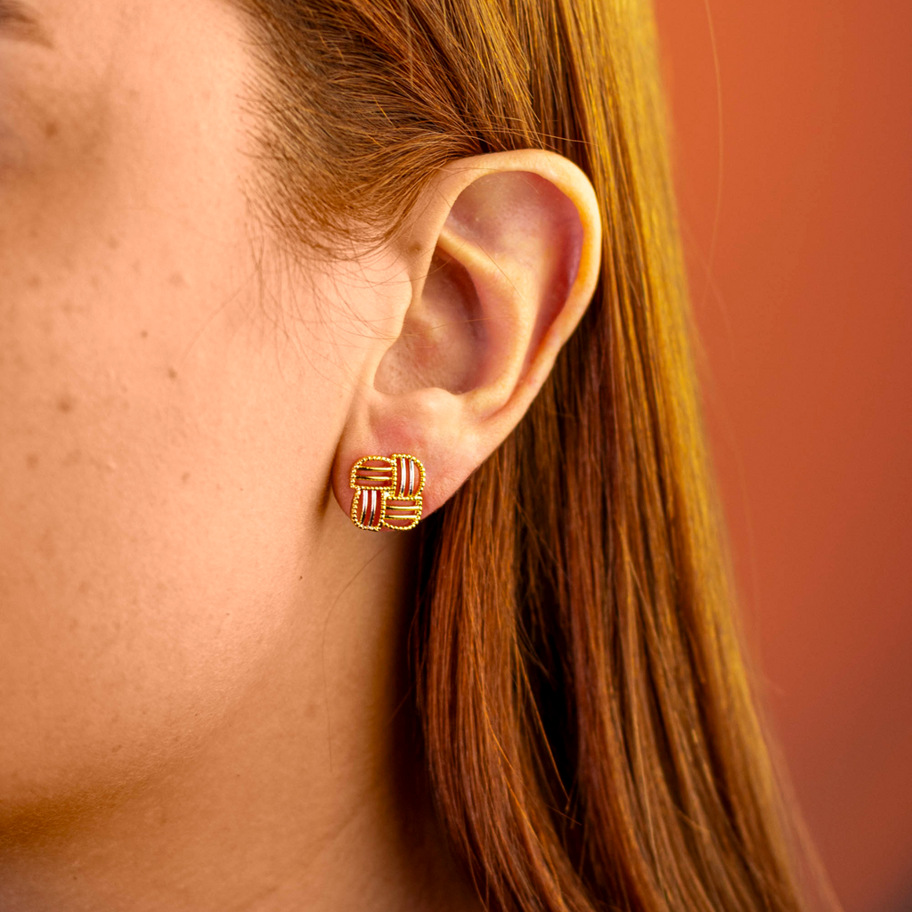 Sofisticação têxtil em forma geométrica: o Brinco Dourado Quadrado Trama Entrelaçada Texturizada combina estrutura arquitetônica com textura sofisticada. Perfeito para looks profissionais modernos, eventos urbanos ou para adicionar interesse visual a produções minimalistas. Uma peça que expressa refinamento contemporâneo.