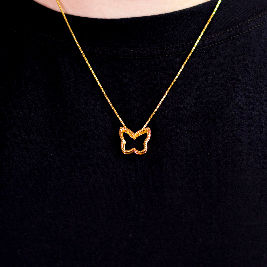 Leveza e liberdade traduzidas em joia: o Colar Dourado com Pingente de Borboleta Vazado em Contorno Delicado é uma peça que inspira renovação e feminilidade. Seu design vazado combina com looks leves e visuais que pedem simbolismo sutil.