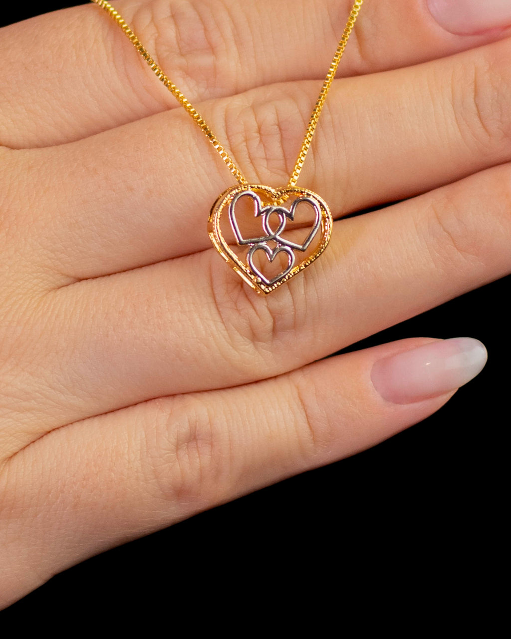 Mais que um acessório, um símbolo de afeto: o Colar Dourado com Pingente de Corações Vazados Entrelançados em Design Romântico traz três corações unidos em um pingente vazado encantador. Uma joia perfeita para celebrar o amor em todas as formas.