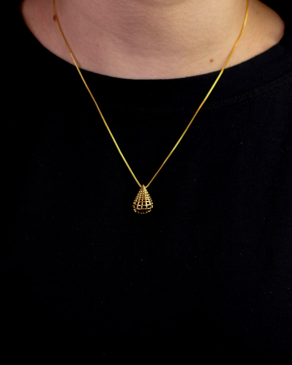 Estilo contemporâneo e ousado: o Colar Dourado com Pingente Gota Vazado em Design Geométrico 3D traz volume, leveza e presença para qualquer produção. Seu formato tridimensional é ideal para quem busca joias com personalidade.