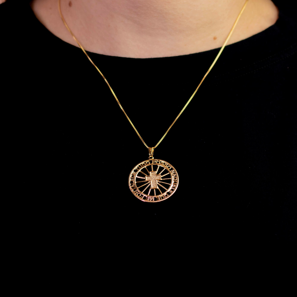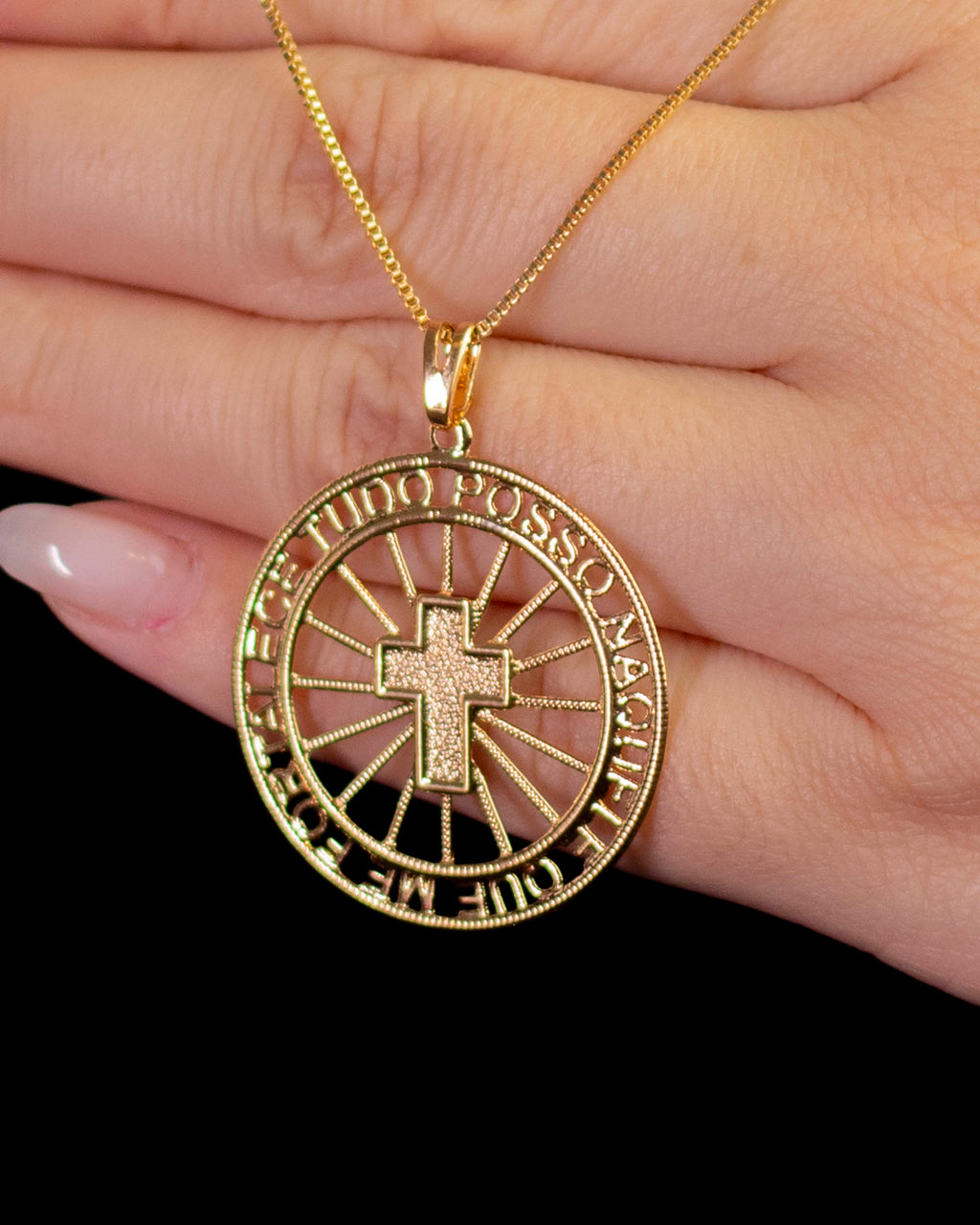 • Acabamento: Pingente redondo com cruz central texturizada e frase em alto-relevo